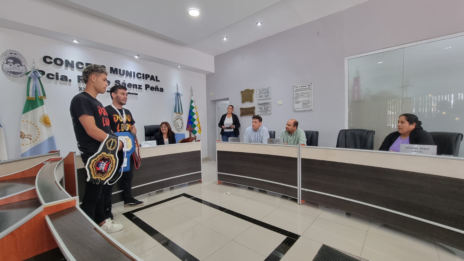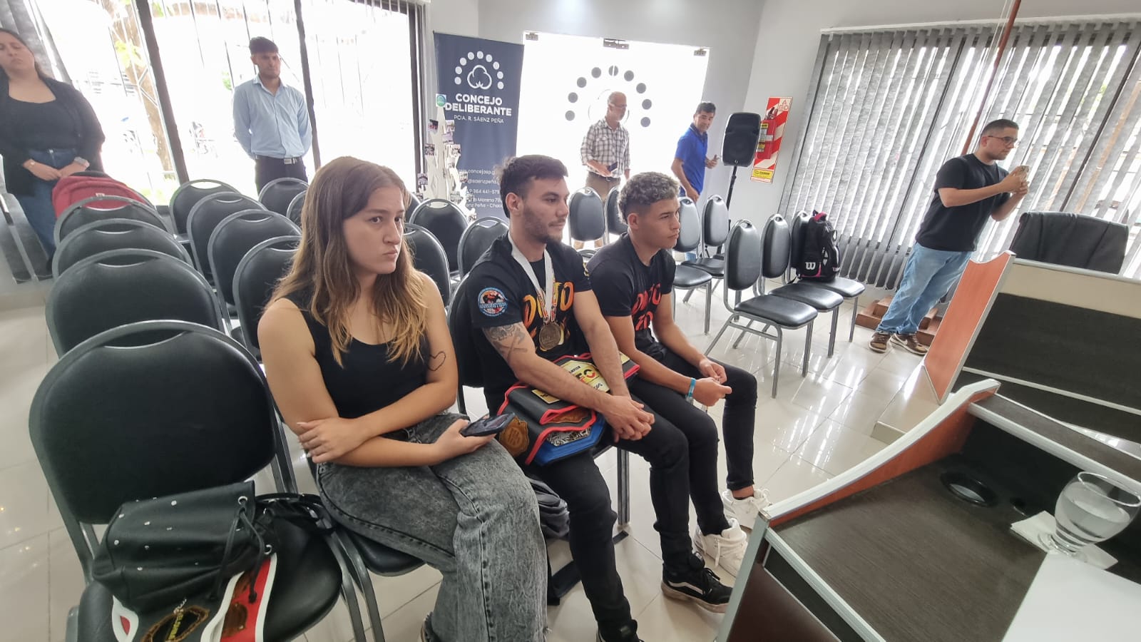 En el recinto del Concejo Municipal se llevó a cabo la entrega de la Resolución de Presidencia N° 062/2025, mediante la cual se reconoció a los deportistas Eliezer Pavón y Carlos Jara, campeones panamericanos de Kick Boxing en el Campeonato Panamericano WKF, realizado en la ciudad de Bucaramanga, Colombia.