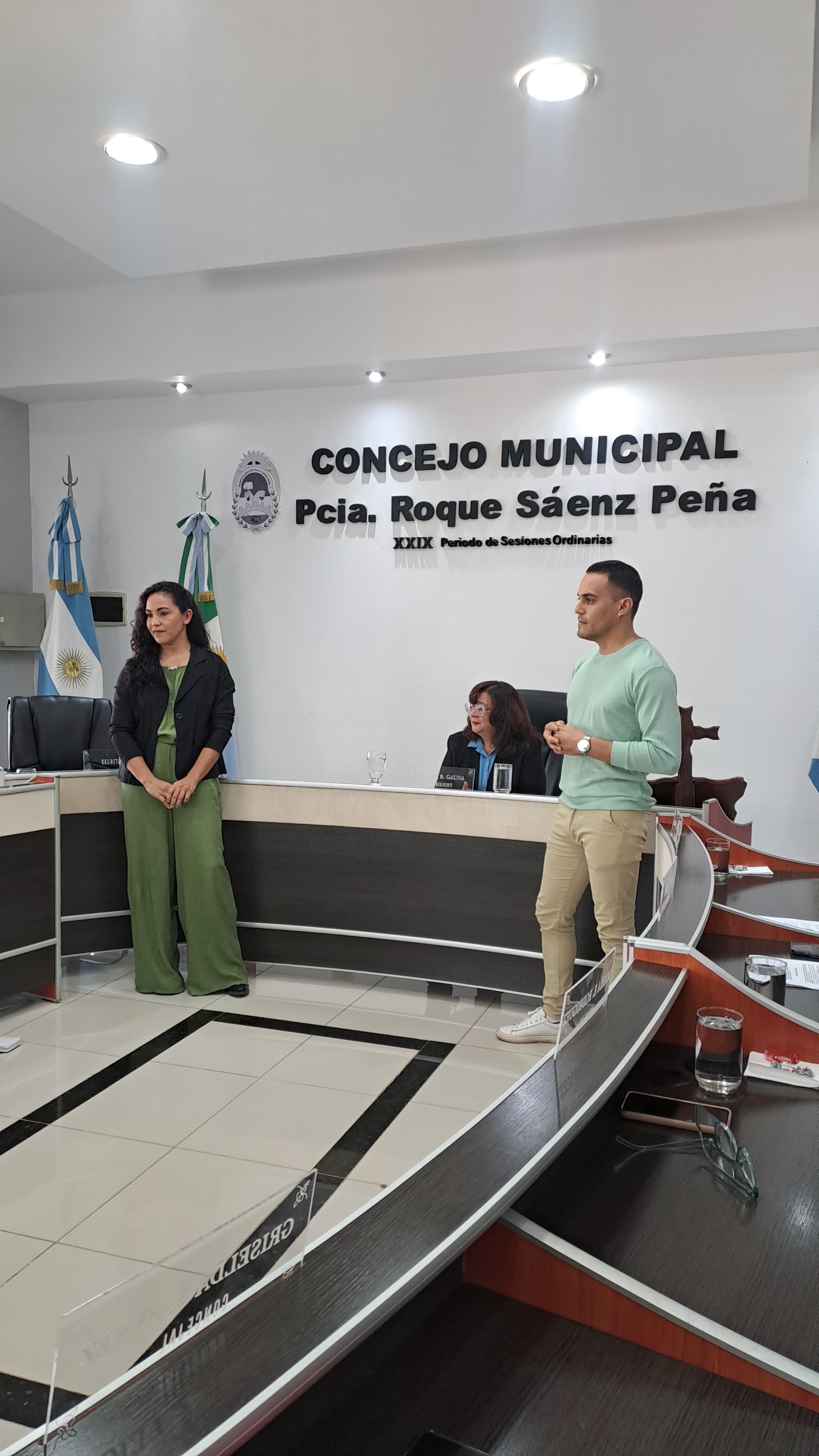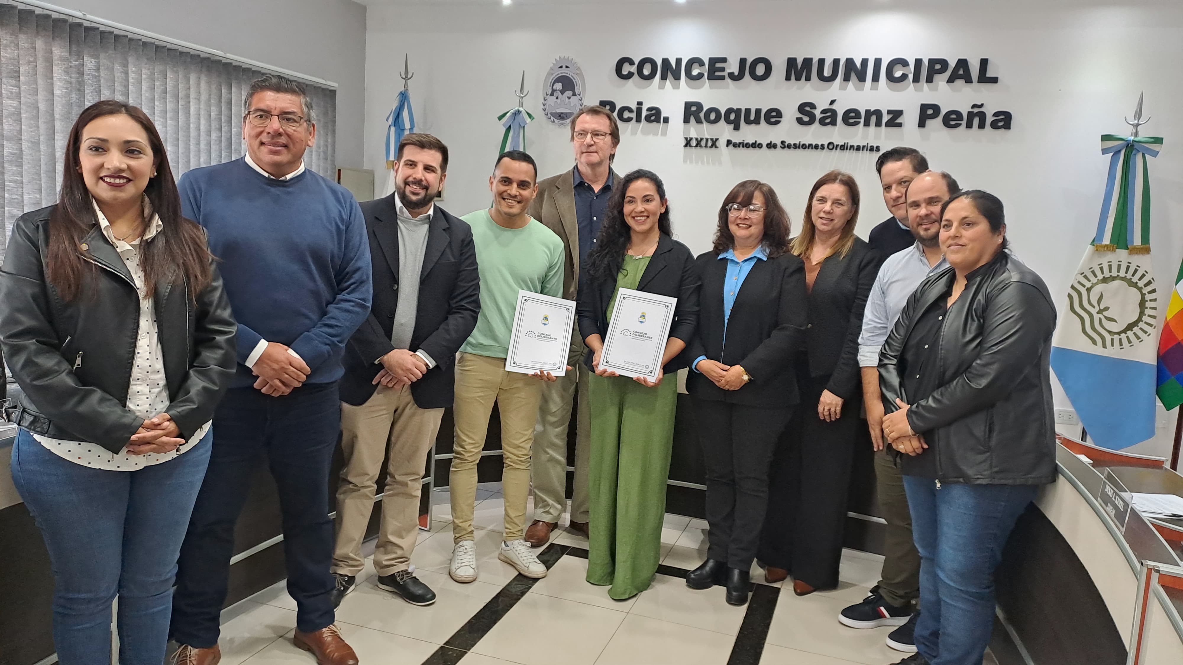 Los profesores María Belén Cancelarich y Leonardo Cancelarich explicaron a los concejales la tarea que realizan y recibieron una copia de la resolución sancionada. 📜👏